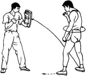 要领:这主要是练习连环腿法,助手可在拳手第一脚中靶 后向后、向两侧移动,拳手则注意估测距离。如果只站在原地 死踢连环腿,那么在实战中会因对手离开原位而难以命中,反 而会挨打。