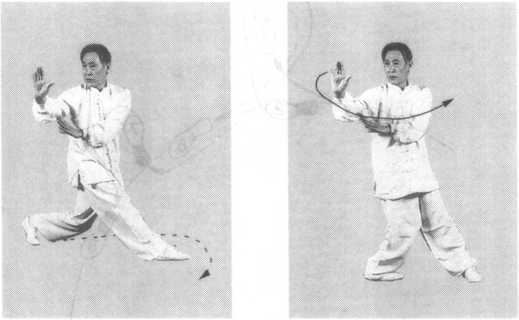 左脚(圈外脚)进步,做半扣步。左脚横于右脚前,右脚尖 对准左横脚的中心方向,两脚成90。(丁字步),上体姿势不变 (图 4.3.2)o