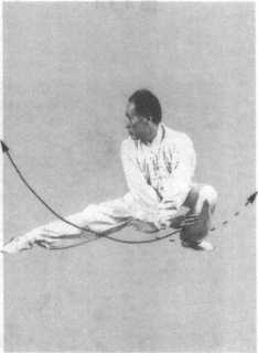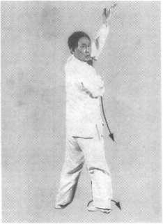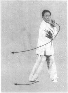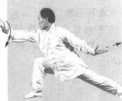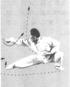 转身向右,右腿远伸,身体下蹲仆步,重心偏左腿。右腿 挺直,右脚尖稍向里合。右臂随转身而下垂,画弧撩掌,好像 行步前撩开长衣一样的动作。臂与地面平行,小指翻向上方,