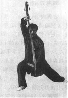 要领:弓步大腿水平,脚 尖向前;后腿要直,脚尖外摆; 上体正直,两臂接近直,刀竖 立胸前。