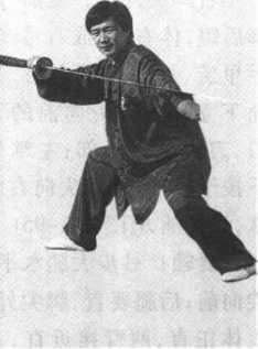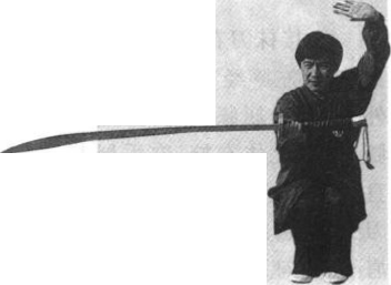 要领:行步转圈背对圆心, 行风轮步或鸡蹬步,一般行转一 圈;上体右倾,右臂半弓,左臂 直,刀尖向左下低,力达刀刃。