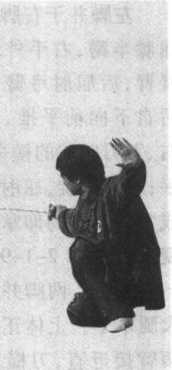 图 2-1-95图 2-1-95左脚并于右脚里侧,两腿 屈膝半蹲;右手外转,先直肘 展臂,后屈肘弓臂,刀从上经 后自下向前平推,成刀尖向 右、刀刃向前的横平刀与胸口 平;左掌里旋,屈肘弓臂上托, 成掌尖向右的仰掌高于头,目 视正前方(图2-1-96)。