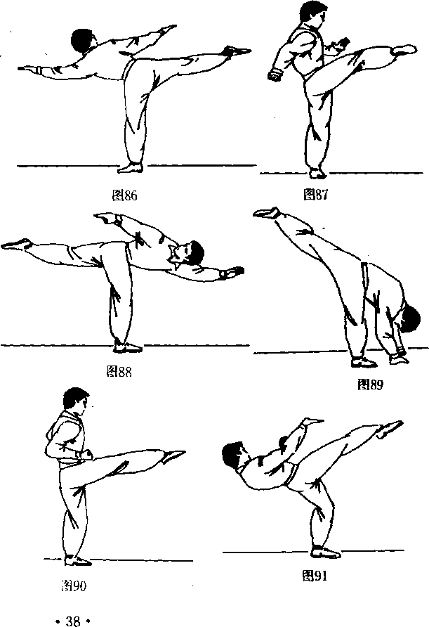 点腿为叶里藏花之母。即一脚站立,另一腿直劲点击。腿 击时,脚面绷平,腿屈伸以脚尖弹点对方,着力点主要是大脚 趾。点腿时要求出腿非常疾速,一点腿即屈膝收回,正是“发时 如放箭,收时如烫火J故有“点腿如穿梭”之说。点腿可分为穿 枪脚(图86)、仄点腿(图87)、穿梭偷点(图88)、趴点(图89)、 弹点(图90)、仰点(图91)、插点(图92)等。