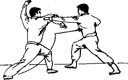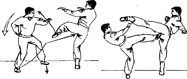 【例33]敌方起左脚向我头部踹击而来,我则向左侧 闪身以避,并起右腿以“仰点”弹点敌方裆部。(图107408)