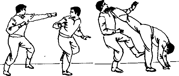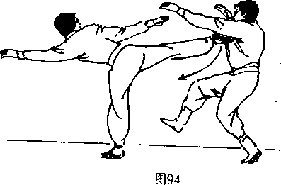【例28】 敌方上步以左直拳向我击来,我出右手拦截 来拳,身体前弓。随之立即身体左转并后倾,左脚站立,起右脚 脚面绷平,脚心斜朝上,高与胯平,向敌方胸部点击。此腿亦称 “穿枪腿”。(图 93、94、95)
