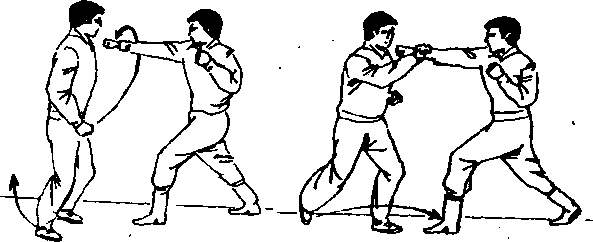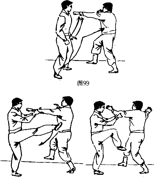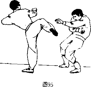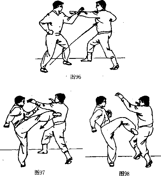 【例29】 敌方出左直拳击我,我则出左手向左拨开其 手,然后身体左转,起右脚挺直,以脚面、脚尖向前点击敌左肋 部(脚掌向左)。此腿亦称“仄点腿”。(图96、97、98)