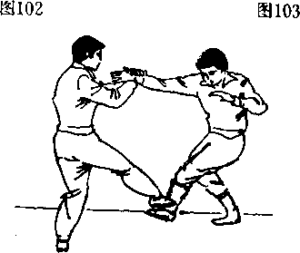 【例31J敌方以右拳平击我胸,我左闪以避,并出右手 向上擒拿刁抓其腕。左腿微屈,右脚脚面绷直向前弹点,出脚 尖插点敌脚踝。此腿亦称“插点工(图102J03J04)
