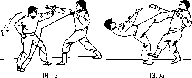 .【例32]敌方以右拳向我击来,我出左手立掌向左上 方拨格开其手,并立即左腿微屈站立,上身后仰,同时右脚脚 面绷平向前、向上弹点敌方头部。此腿亦称“仰点,(图105、 106)