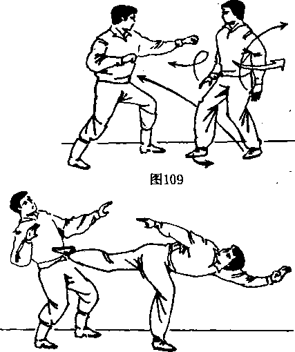 【例34】 敌左我右。敌方上步以左直拳向我击来。我 身体左转,上身前俯,右腿屈膝站立;左脚随转身收至胯旁,再 向后上方穿出,脚掌朝上,点击敌腹部。腿高与胯平。(图109、 110)