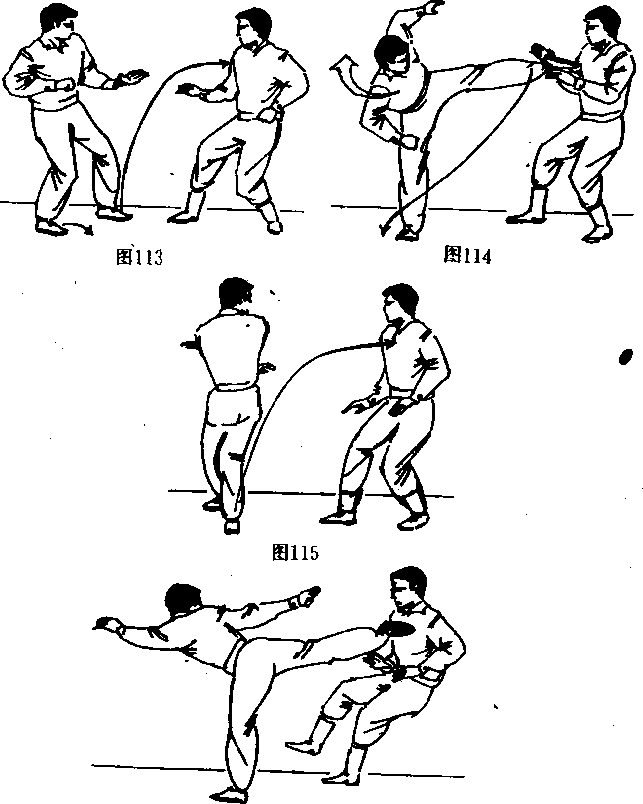 【例361我方主动攻击敌人。右脚上半步,起左脚随身 体后倾而脚面绷平向前点击敌胸部,左膝下扣,脚心斜朝上, 高与胯平。(图113、114)敌若出手相拦,我则迅速收回左脚 并下落于右脚后,身体向右转180。,侧后视敌。双手交叉收回 于胸腹前。(图115)上动不停,左腿直立,上体左倾;右脚脚 面绷平向右后方点击敌胸部。双手同时分出。此腿亦称“翻环 点腿工(图116)