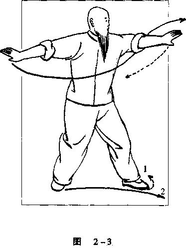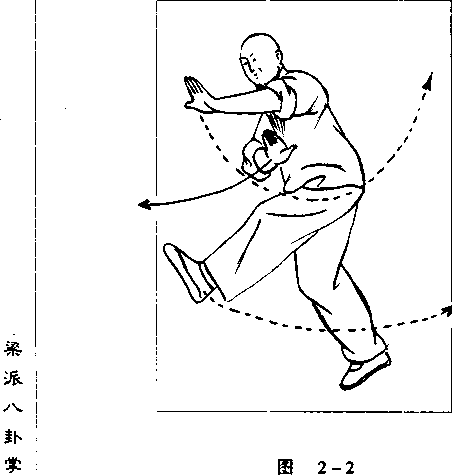1 .双换掌,又名盖掌。由单换掌左推磨势 开始向左转行。如图2-1所示。2 .左推磨势沿圈线转到北面,左脚在前时 停步。右脚沿圈线向前上一步,右手和上身保持 不变,重心移向右腿;继而左脚向右前方踢(高 不过腰,脚面绷平)而左掌在上右脚的同时向下 落,不停,继下落势向左向后向上前抡一圆圈, 恰在左脚上踢时用左掌拍向左脚面,如图2-2 所示。第六章八卦掌的练法及图解第六章八卦掌的练法及图解第六章八卦掌的练法及图解第六章八卦掌的练法及图解