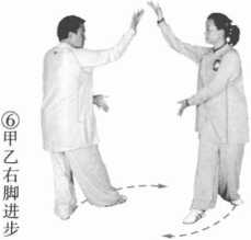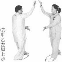 (1) 甲乙左脚上步外摆,右脚上步内扣;左手后插于背后,右手置于右胸前