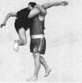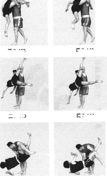 对方右鞭腿打击我方头部或胸部,我方弧形进左脚,脚尖外撇,左转腰上右 脚,顺势左臂挂抱住对方左大腿,右臂抱住对方腰部;借对方鞭腿打击力量,顺 势继续左转腰,左后上抬大腿,将其旋起摔倒。