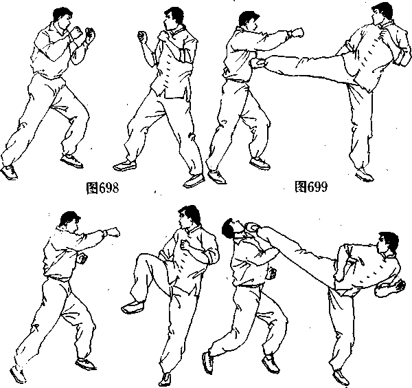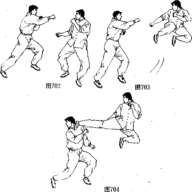 对手注意力,接着,迅速抬起右脚用侧踢腿出其不意的重创对 手的腹部或胸部,将其防线打乱(图699);然后不待对手退出 攻击距离,又在左脚略向前垫步的同时,用一记侧踢腿击中了 对手的胸部(图700、图701),将其迫退(图702);此时,李小 龙乘机腾空跃起(图703),在空中用一记强劲有力的腾空侧 踢腿猛击对手头面部(图704),将踢伤或击倒在地。