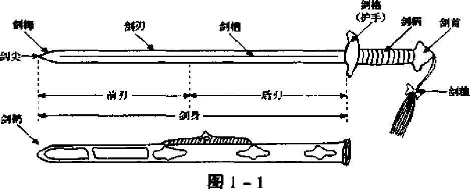 剑的结构包括剑身、剑柄两大部分口剑身由剑 刃(又分为前刃和后刃)、剑身、剑锋、剑血槽构 成;剑柄包括剑格(护手)、剑柄、剑首,其次还有 剑袍(剑穗)、剑鞘等附属物。详见剑各部位名称 (图 l-l)o