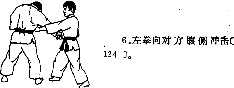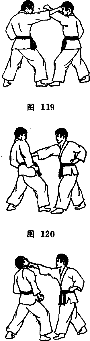 2.右拳向对方心窝儿冲击(:图120九2.右拳向对方心窝儿冲击(:图120九3,又可向对方下颌冲击〔图 121 1.3,又可向对方下颌冲击〔图 121 1.