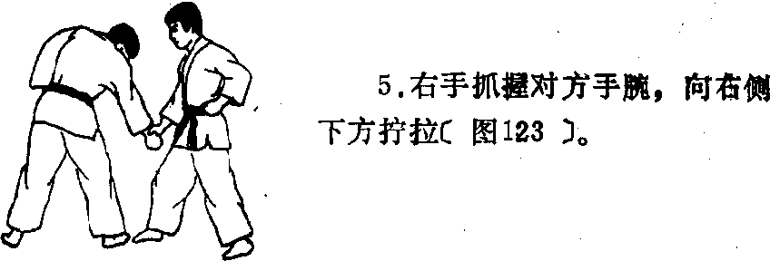 图122图122图123图123图图4 .对方右拳向右上盘冲击时, 左脚向后撤步J同时,右拳屈肘向 上盘前方架起防守匚图122 X