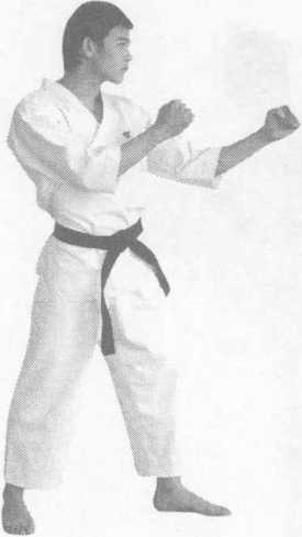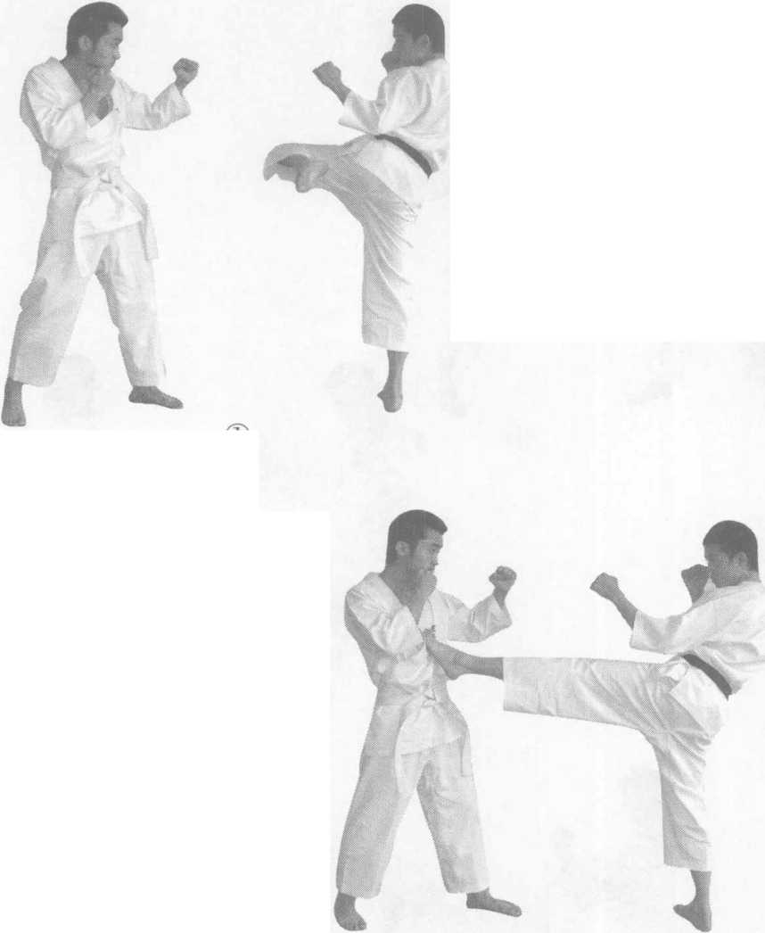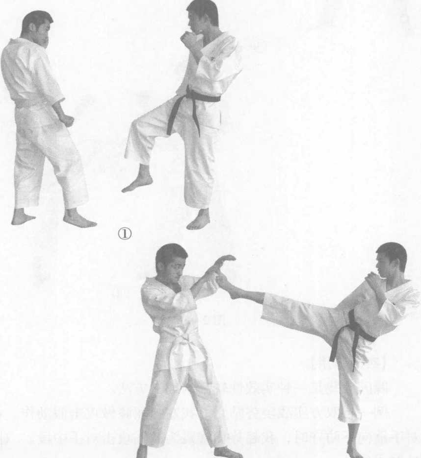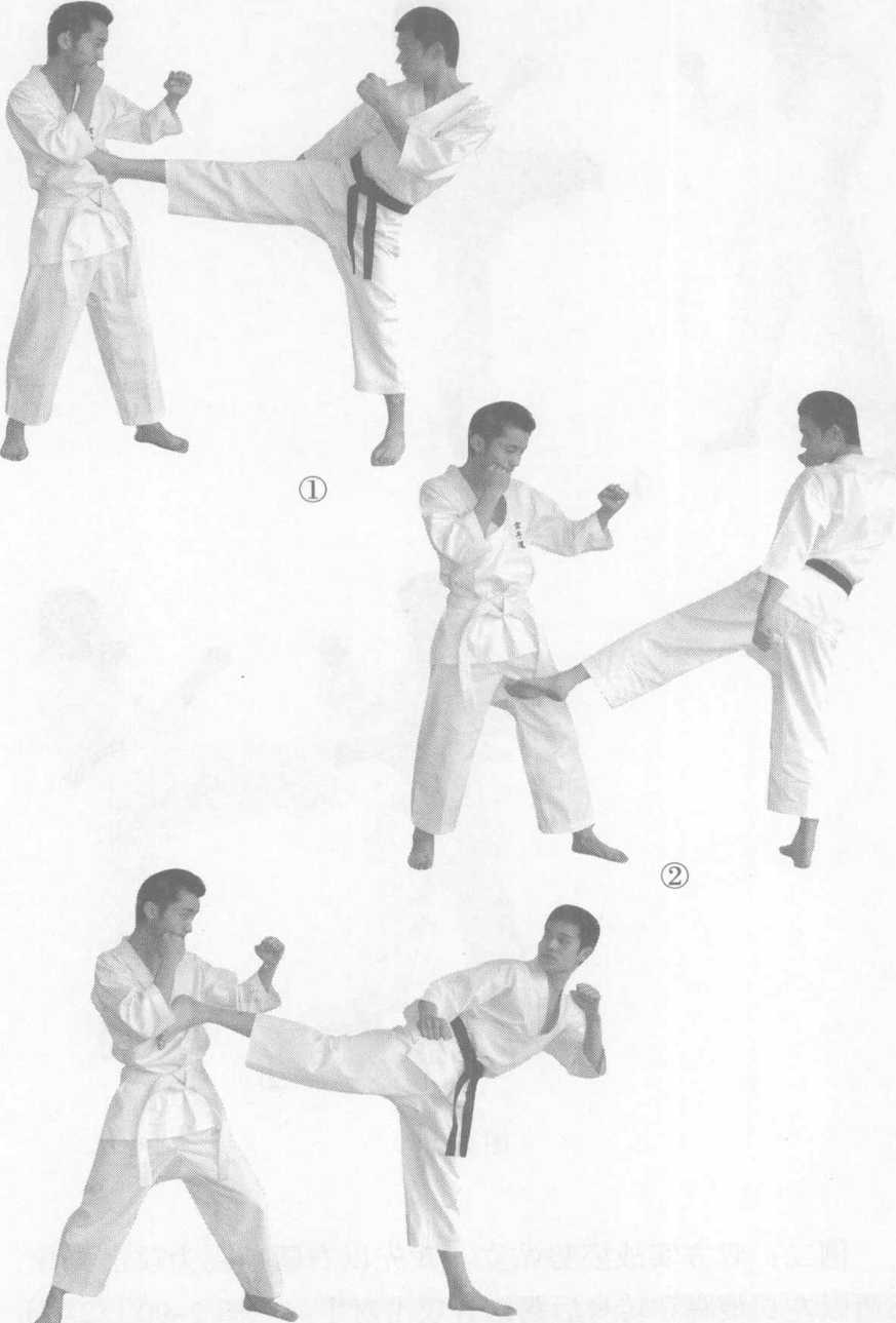实战姿势开始。身体纵向跳起,在空中双脚连续完成两次 前踢称为二段前踢。