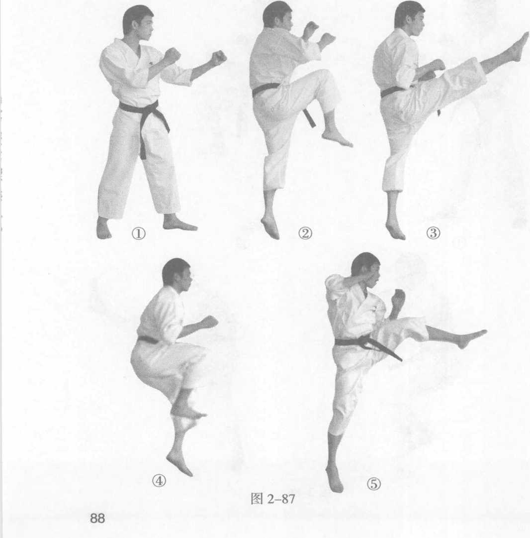 左脚用力蹬地起跳;同时,右腿屈膝上抬,在空中完成第 一次前踢,随即在右脚落地的同时左脚迅速做第二次前踢。 (图2-87①?③④⑤)