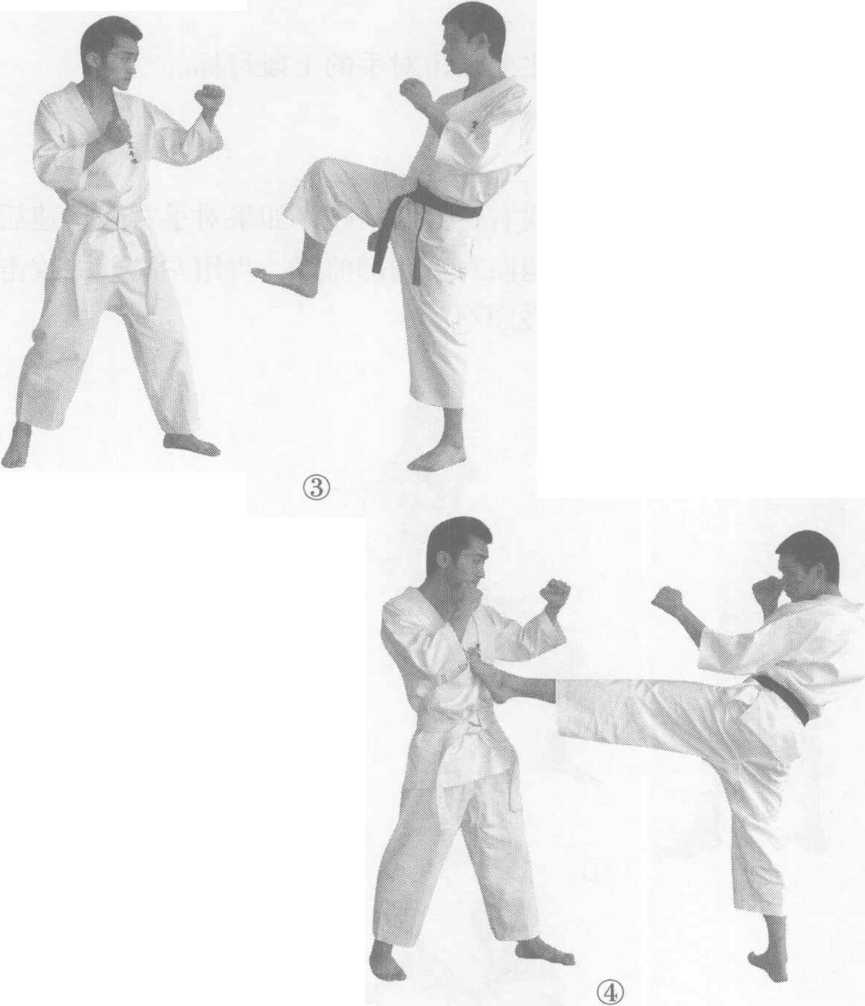 双方实战势站立。我右腿提膝前踢,如果对手右腿迅速后 撤时,我快速蹬地以右腿向对手胸部前踢,再用左脚前踢攻击 对手胸部。(图2-88①@③④)