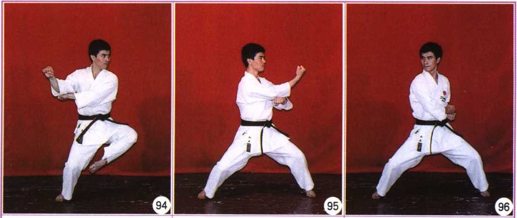 右脚向内提起轻触左 大腿内侧,再回撤原位,落 脚同时上体向右拧腰,右 臂旋内横格挡,拳心向斜右脚向内提起轻触左 大腿内侧,再回撤原位,落 脚同时上体向右拧腰,右 臂旋内横格挡,拳心向斜 下方。下方。左腿向内提起轻触右 大腿内侧,再回撤原位,落 脚同时上体向右拧腰,右 臂旋外横格档,拳心向上, 转头目视左方。左腿向内提起轻触右 大腿内侧,再回撤原位,落 脚同时上体向右拧腰,右 臂旋外横格档,拳心向上, 转头目视左方。动作提示:做左右格 挡时,不随上体的拧转而 改变步型。