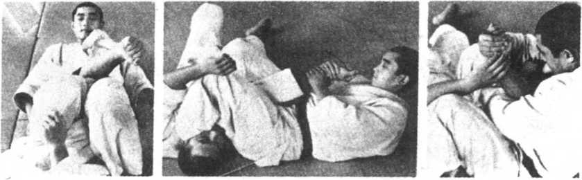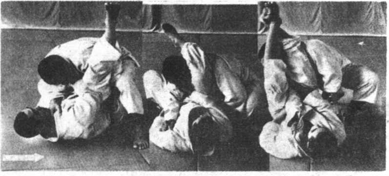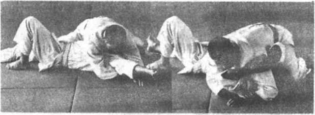 后面向上移,越过头部从前面贴着颈部,两条大腿夹住其后臂,腰 伸直,上身向后仰,两手拉紧,别住对方。如受方向上挺身想抽出胳 膊时,会别得更紧。