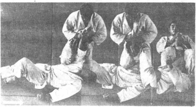 ① 仰面朝天,按照“从下面进攻姿势”的要领对付受方。受方按 照第20教程的固技的进攻方法④⑤的要领,将左手从胯间插进 去,左肩向上顶,以进攻取方?。此时,②取方从受方颈部的左横侧搂 住右腿,同时,向右转身改变角度,③与此同时,左腿从受方的右肩