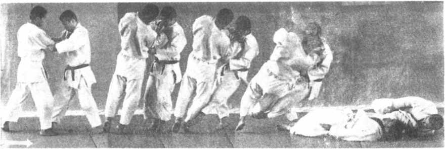 ①取受双方相互接近,进入约0.9米的距离,取受双方迈出右 脚成右自护体抓把。②取方右手拉起对方,右脚同时向后撤1大 步,受方随即向前迈左脚。③取方为了恢复成原来的体势,两手用 力使受方的身体离垫,受方欲保持身体稳定,右脚向其斜前方迈 进。此时,在受方两脚成一直线的瞬间,取方右脚拉近到内侧,同时 将受方向正前方拉引,④身体向后倒下,同时右脚背顶着受方的左 腿窝的上方,从下面向上挑,隔着头部将对方摔出去。受方右前方 滚翻倒地,站起来后,同样地进行左隅返练习。