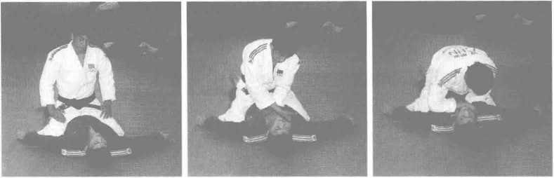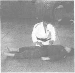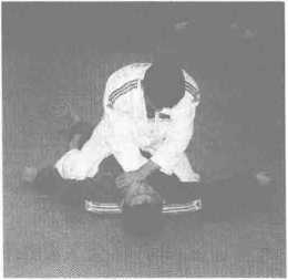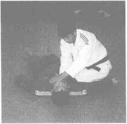 O对方左侧卧时,左膝在对方左侧跪地,右膝立起。胸压对方右肩。左手从 对方右腋下插入,四指在里抓住对方左领后部。右手拇指在里抓住对方右领后部, 身体压住对方,两手用力勒绞。