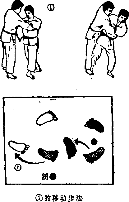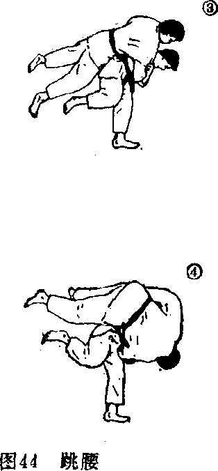 跳腰(图44),当使对方身体向其右前方倾斜时,用右 肩靠近对方右胸,利用腰和腿的弹力,将对方向侧摔下去的 技术。