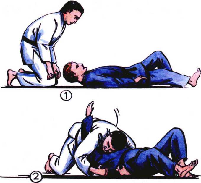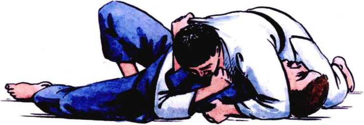 进攻方处于防守方头部方向的上方。将一只手伸入防守方的背后并且抓住腰带,同 时用腋下夹紧防守方的同名手。控制防守方,不让其翻身腹部着地。