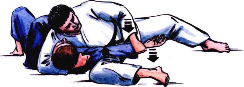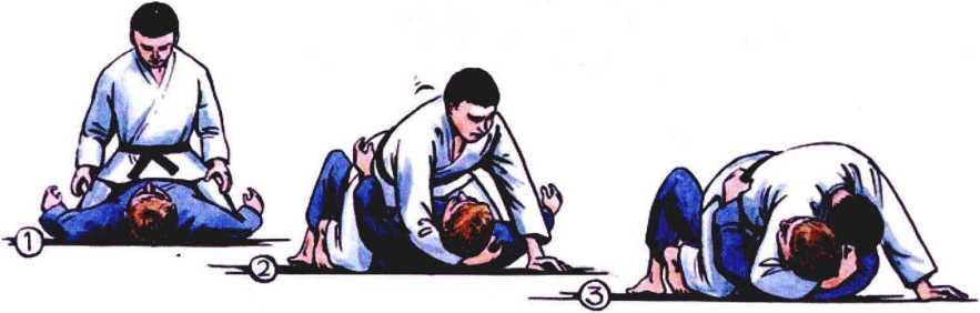 防守方后背着地。进攻方在防守方的上方(面对面)。起重要作用的是双腿。在压 紧大腿的同时,进攻方使防守方难于摆脱抑制。用一只手抓住防守方的头部。在此种抑 制情况下,进攻方用空着的一条腿支撑榻榻米,利用榻榻米作为补充支撑。