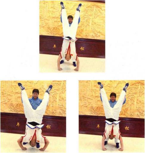 双手手掌按地,双腿向后抬起支撑于墙面(其他支撑物亦可),身体呈倒立姿势。 双臂弯曲,身体前倾,然后伸直双臂,重复以上动作。此动作类似于倒立俯卧撑,过 去称为“堆脯”,可以锻炼手臂力量与胸部肌肉。