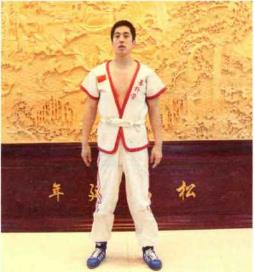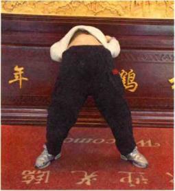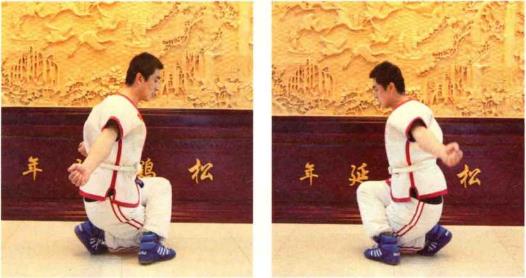 双脚分开,与肩同宽。脚跟稍微离地,以脚掌为轴心向左转动身体,同时屈膝下 蹲,呈卧步姿势,左脚在前右脚在后。在转动身体的同时,双臂由内向外、由下至上