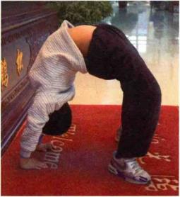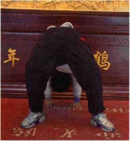 采取站姿,背对墙面,身体后仰,双手扶墙向后弯腰 循序渐进,练到双手摸到 地面为止。窝腰是为以后“翻七寸”打基础。
