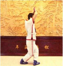 绕过头顶,最后处于水平位置(可起保持身体平衡作用),目视前方。身体起立,转向 右侧重复同样动作。练习小威桩时身体起落要有力,开始练习时一边做10次动作,以 后逐渐增至20次。蹲下后施加外力难以推动,即达到训练效果。
