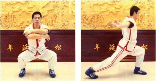 身体下蹲,双脚马步站立,双手抱于胸前。双脚放松,脚跟稍微抬起,以脚掌为 轴心身体转向左侧,双腿呈“弓蹬步”,左腿弓,右腿绷,同时双手用力分开,尽力挺 胸,目视前方。接着身体转向右侧,重复上述动作。需要注意的是,前腿膝盖不可超 过脚尖,后腿用力绷直。