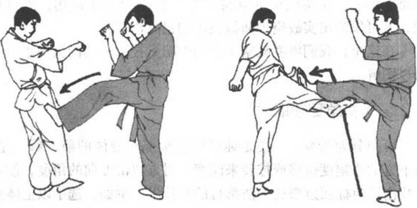 此技同前面几个技法一样,是以攻为守的难度性防御技术。 要求选手能瞬间判定对手是采用前踢或旋踢,并于同时起足封