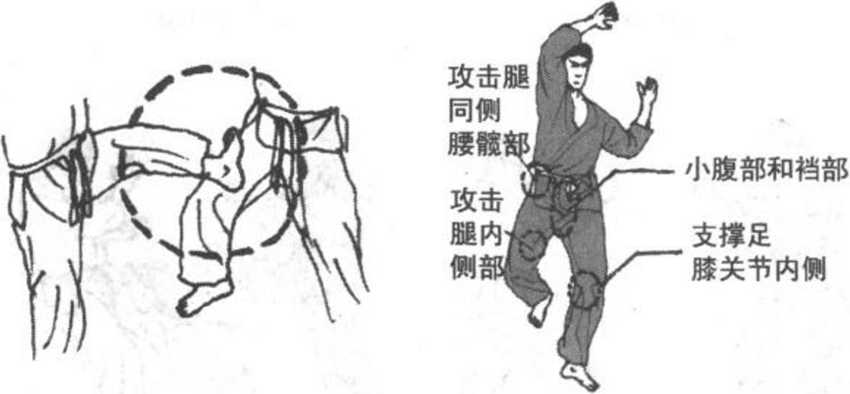 既攻且守目的。由此我们可以总结出几个最基本的踢击拦截反击 部位,参见(图968)(当然,除此而外,攻击腿的膝胫、小腿 部位亦是较好的拦截部位,可参见“以腿防腿”有关防御技术内 容),再提醒一点:拦截反击成功时,必须立即把握机会连续的 压制反攻,以扩大胜果。另外,为保证成功,选手应选择机动灵 活的高桩姿势。即马步不可太低,否则起动慢。同时与对方要保 持适当的监察距离,以获得足够的判断,动作时间也是要注意 的。