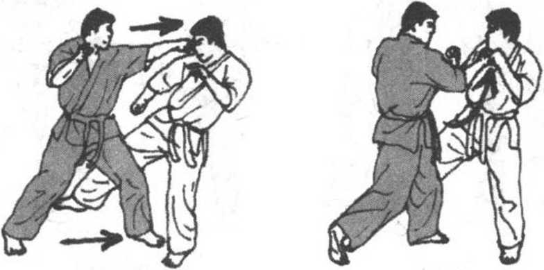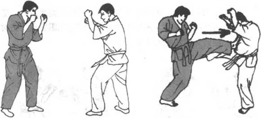 (图973、974)实战图解,是以直拳迎击来反击对方低位旋 踢攻击的以攻为守的例子。在实战中,倘若对方某次攻击威力不 大,或自己具备硬打直上的功夫,就可采取此种不管对方如何攻 击,只管冲前发动凶猛反击的主动打法,在本例中,选手迎击得 手之后,接以上击拳连击来扩大战果。在具体运用中,受击部位 必须要紧张用力,以承接受力——当然,当选手凶猛前冲之时,
