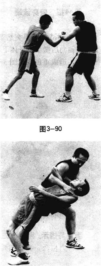 图 3-88 图 3-89要点与提示:压臂准确有力,侧上步、右转身、扣锁肩 三动合一,快速连贯,意、气、力相合。锁控对手成功时,对 手所处的位置应该在我的身体前面。