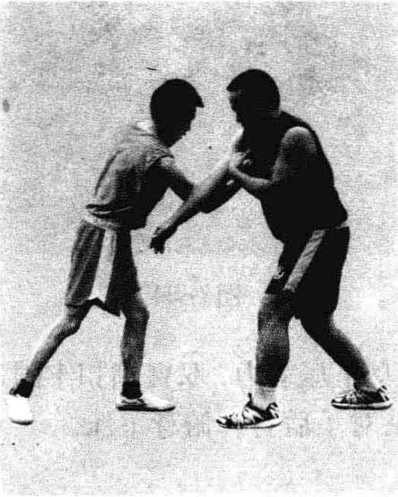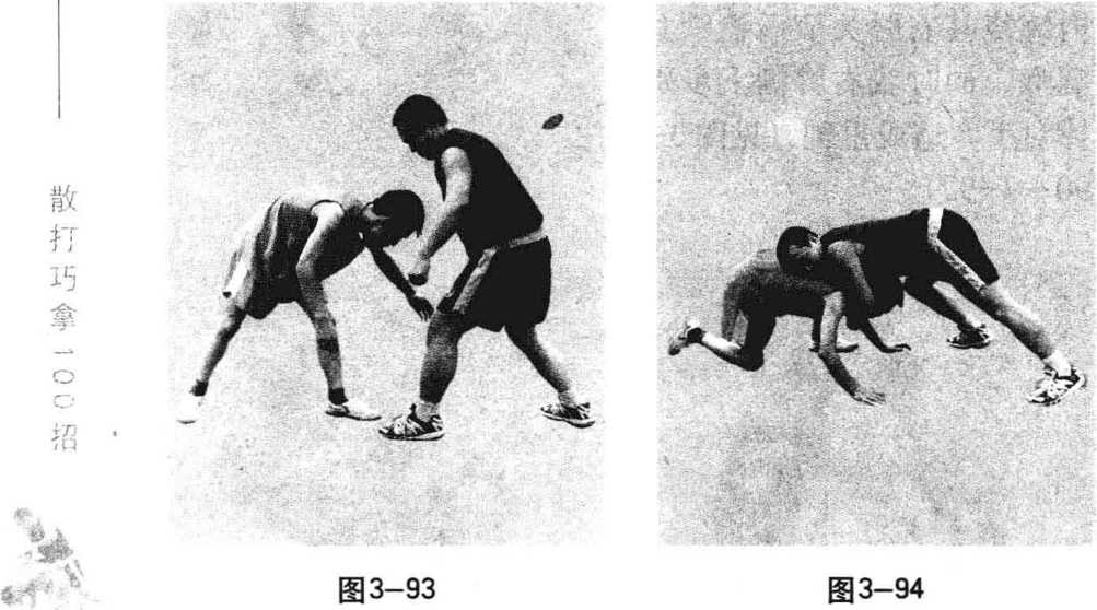 双方对战,对手突然潜身用抱腿摔抢攻我,我快动应 变,左腿向后撤步,身体下俯,同时用左右臂环抱扣锁对手 的头颈,造成重创(见图3-93?3-94)。
