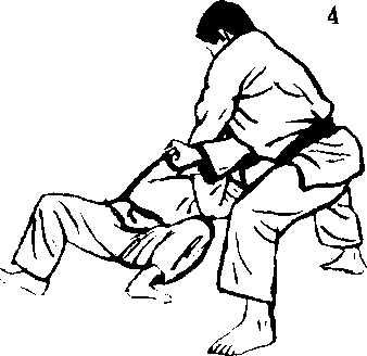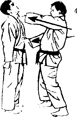 4. 把对方拉到1的演 武者的右脚边,在对方 要倒下的一瞬间,右脚 以滑脚方式踏前一步, 以双手突击倒对方。左 手朝对方的喉咙,右手 朝对方的心窝下方,使 出突技(参照三十六手 的 35 ?:;7)。