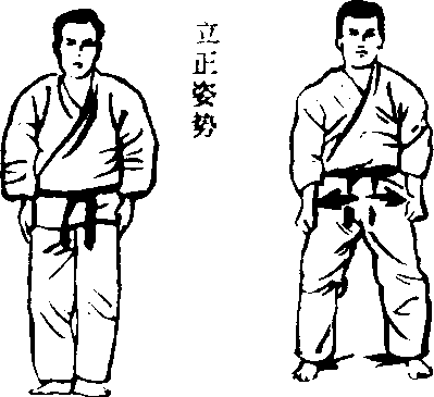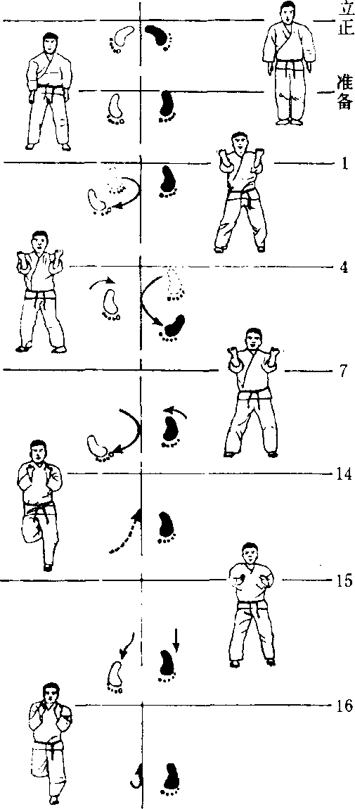因为四方向的演武线上招式的种类不同,难免造成起点和 终点立正姿势位置上的偏差动。要注意掌握的顺序,习惯力量 分配,然后测出自己的步数,以便能从起点回到起点。