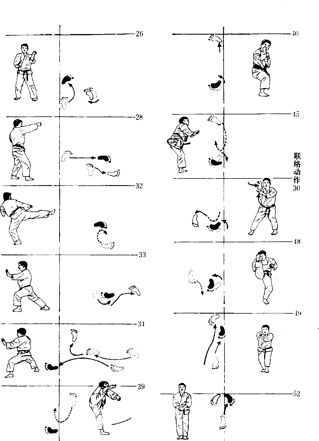 十三手和三十六手,都是在十字形的演武线展开招式,但 在内容上〔虎形〕十三手的层次更高。演武线和所需要的时间 似乎比征远镇少,怛在短时间内就使用五十六个招式,所以招 式种类比征远镇多出许多。尤其,小招式连续动作的使用必须 顾及速度?充分利用了刚柔流独特的开手“挂接”。