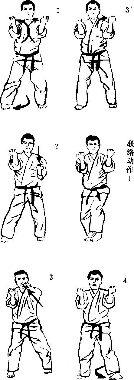 1. 右三战立的架式 以三战右脚踏前一 步,手摆出三战的架式