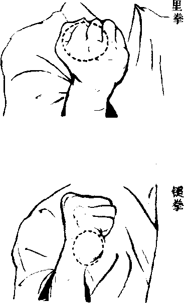 锤拳是将正拳从小指到手腕 为止的中间肌肉部位改成直握。 以此部位如铁锤一般砸下,手腕 和拳头必须成一体,固定