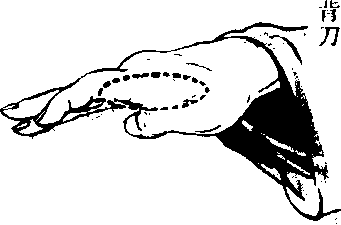 所谓背刀,是把手刀的背侧 甩舉攻击的称呼,和手I刀的手外 张的情形m反,把拇指的第一、 第二关节弯曲,食指的第二关节 到拇指第二关节之间当作使用部 位透过拇指的力置,可以使拇 指和食_之间的肌肉隆起: