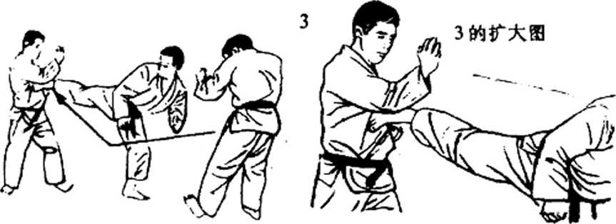 (3) 对手的动作,伺杌而动,(2)当前方的对手前进,移动到有效距离间隔的一瞬间,朝 中段使出前踢技(图1119)。图 1118图 1119图 1120图 1121后方的对手,在2的踢技刚使出之后,为了攻击而前 进,这时夹在中间的人,以2的踢出前踢技的同一御,朝后方使 出脚刀后躇(图1】20?1】21)。