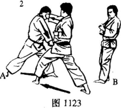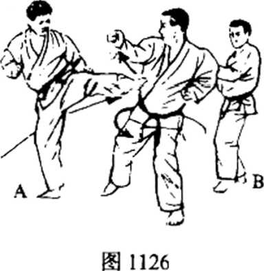 (3) 上体左倾,以便拨开挡住对方的踢技,重心落在左脚,准备 使出下一攻击招式。当B从侧面以前踢技踢入时,以2上段突击的手扫 落,同时把视线朝向B(图1124)。